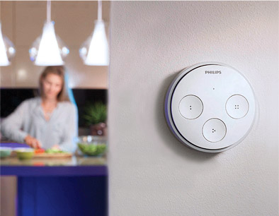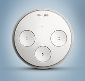 W systemie Philips Hue dostępne są także akcesoria umożliwiające nam sterowanie oświetleniem bez użycia urządzeń mobilnych. Przełącznik Hue Tap to pierwszy bezprzewodowy przełącznik, który nie potrzebuje baterii, a zasilany jest energią kinetyczną (ładuje się poprzez kliknięcia). Możemy nim włączać i wyłączać światło w swoim domu, ale także zaprogramować trzy ulubione sceny świetlne.